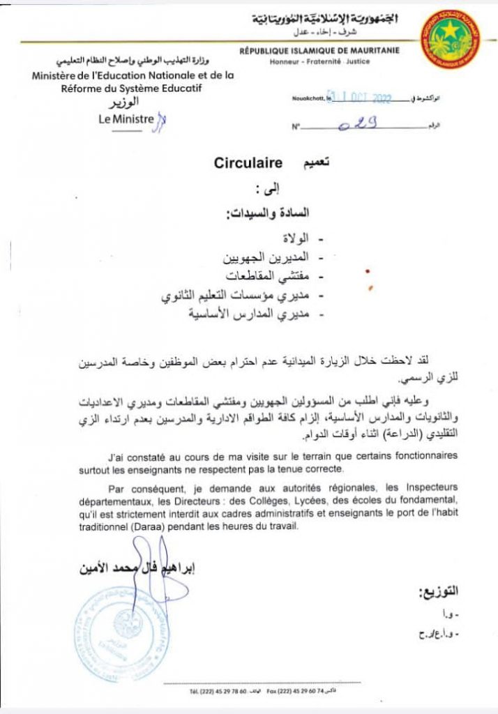أصدر وزير التهذيب الوطني وإصلاح النظام التعليمي، ابراهيم فال ولد محمد لمين، تعميما بمنع ارتداء الزي التقليدي “الدراعة”، بالنسبة للمدرسين في المؤسسات العمومية.