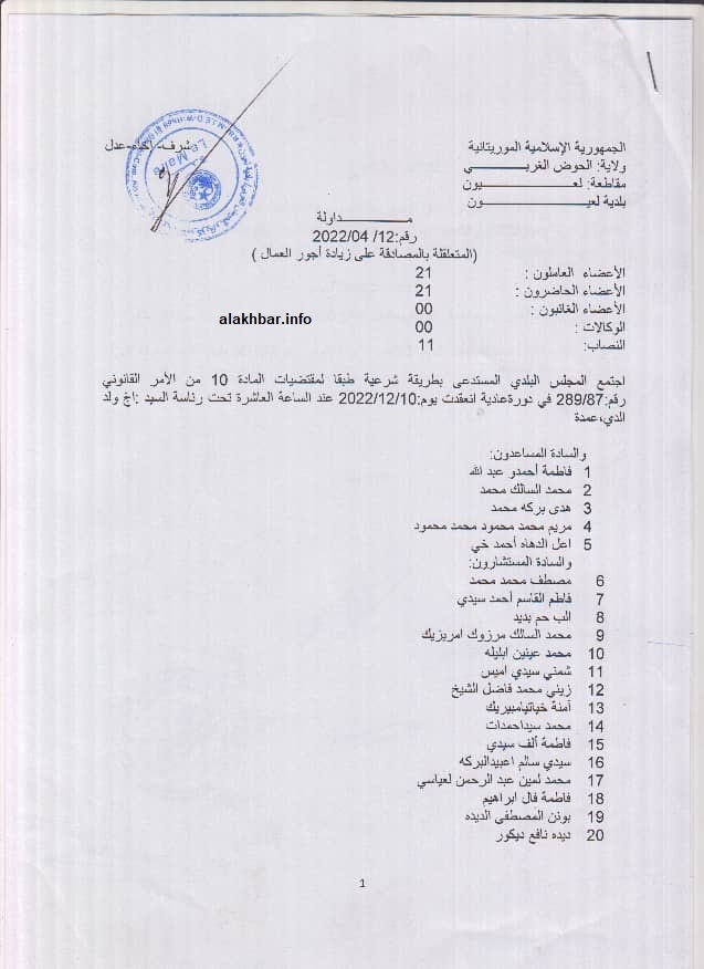 بلدية العيون تقرر زيادة عمالها بمبلغ 20000 اوقية قديمة
