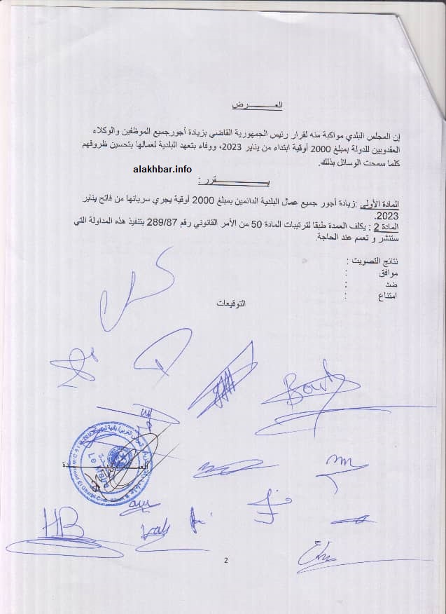 أقر المجلس البلدي ببلدية العيون عاصمة ولاية الحوض الغربي اليوم مداولة تقضي بزيادة مبلغ 20 ألف أوقية قديمة على رواتب عمال البلدية.