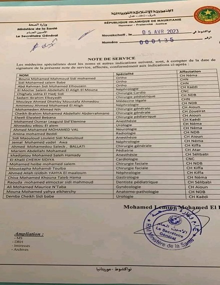 أصدر وزير الصحة المختار ولد داهي اليوم مذكرة تحويل شملت عشرات الأطباء و الأخصائيين تم توجيههم إلى مختلف المستشفيات و المراكز الصحية بالوطن.