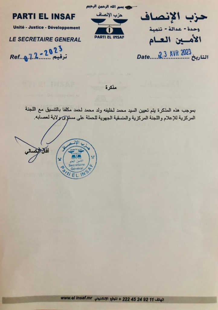 بموجب مذكرة عمل صادرة عن الأمين العام لحزب الانصاف، السيد افال انگيسالي، تم تعيين المسؤول الإعلامي للحزب، محمد لخليفه ولد محمد لحمد، مكلفا بالتنسيق مع اللجنة المركزية للإعلام والمنسقية الجهوية للحملة على مستوى ولاية لعصابه.