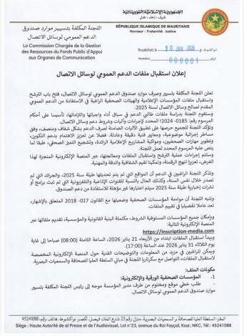 وسيبدأ استقبال الملفات ابتداء من الأربعاء 21 يناير 2026، الساعة الثامنة (08:00) صباحا إلى غاية يوم الثلاثاء 31 يناير 2026 عند الساعة (17:00).ويمكن للراغبين في مزيد من المعلومات والتوضيحات الفنية حول المنصة الإلكترونية المخصصة لاستقبال الملفات، التواصل مع سكرتاريا اللجنة في مباني السلطة العليا للصحافة والسمعيات البصرية.
