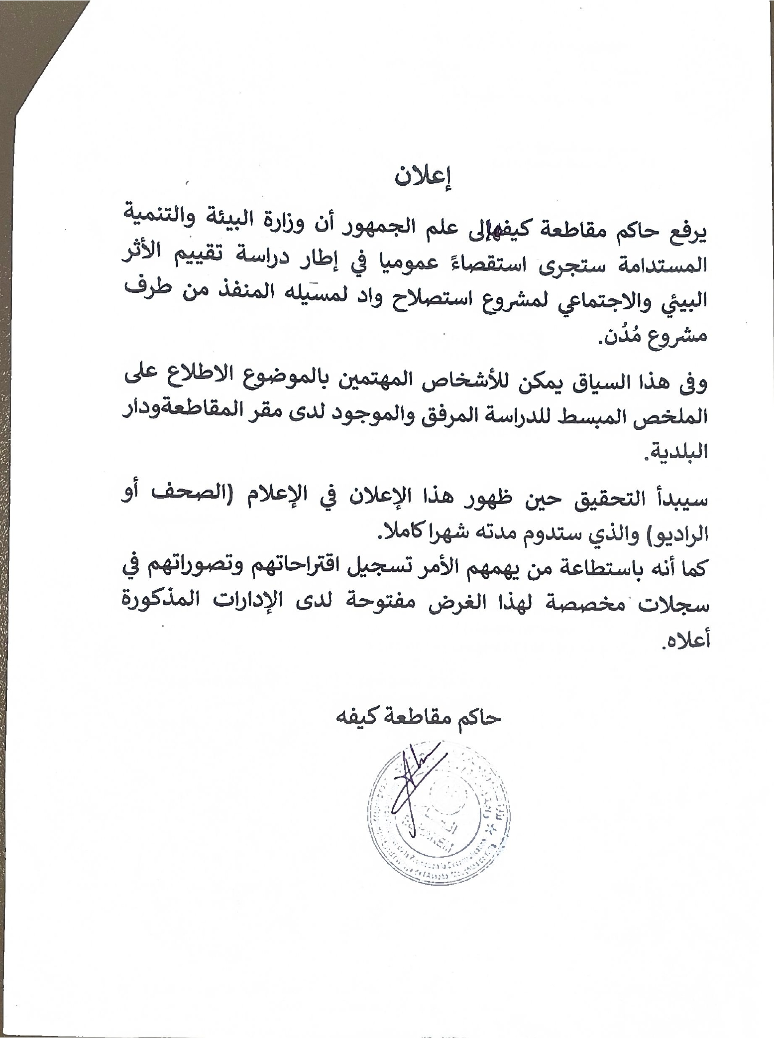 كيفه / الاعلان عن استقصاء عمومي للأثر البيئي والاجتماعي لمشروع لمسيلة المنفذ من طرف مشروع مدن
