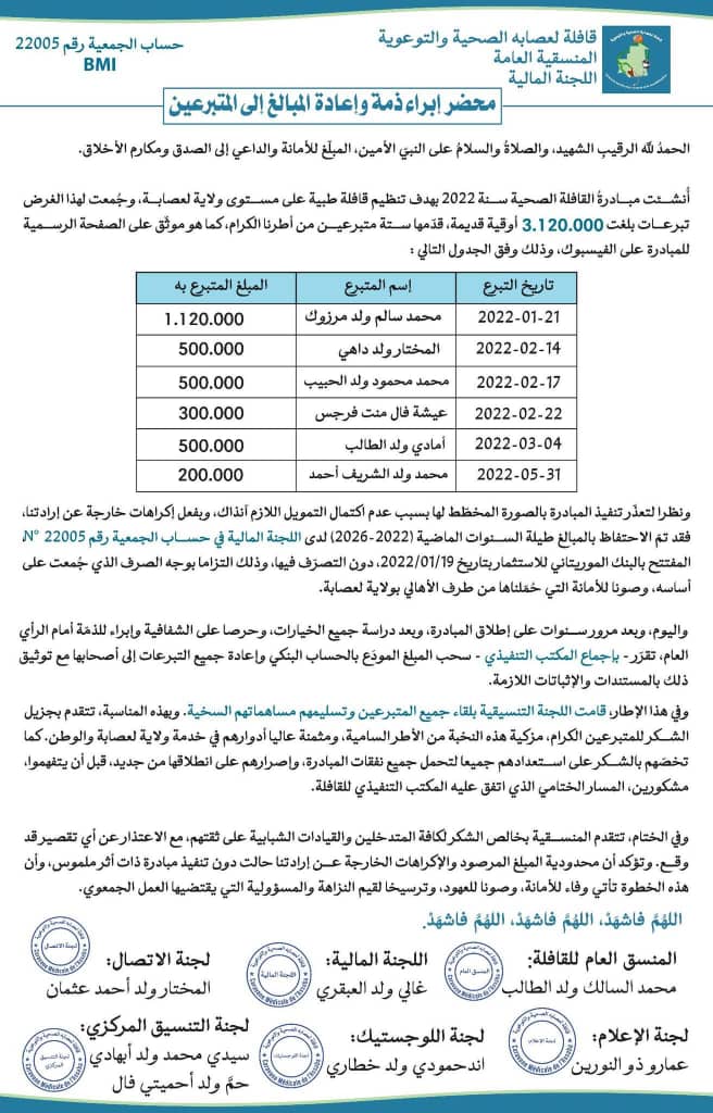 وقالت المنسقية في بيان لها وقعه جميع رؤساء اللجان، إنه “نظرا لعدم اكتمال التمويل اللازم للقافلة وعراقيل خارجة عن الإرادة، فقد تم الاحتفاظ بالمبالغ طيلة السنوات الماضية لدى اللجنة المالية في حساب الجمعية رقم N°22005 المفتتح بالبنك الموريتاني للاستثمار بتاريخ 2022/01/19، دون التصرّف فيها، وذلك التزاما بوجه الصرف الذي جُمعت على أساسه، وصونا للأمانة التي حُمّلناها من طرف الأهالي بولاية لعصابة”.
