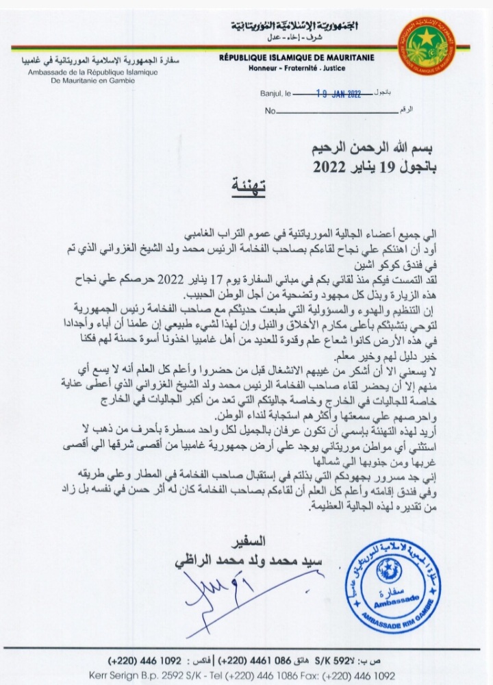 اصدرت السفارة الموريتانية في بانجول تهنئة الى اعضاء الجالية الموريتانية في غامبيا للدور البارز الذي لعبته اثاء زيارة فخامة رئيس الجمهورية السيد محمد ولد الشيخ الغزواني