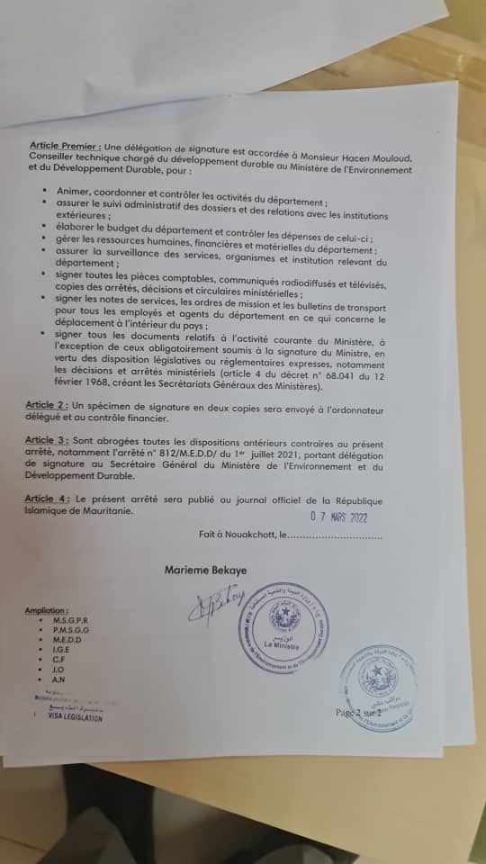 وأسندت الوزيرة بنت بكاي هذه الصلاحيات لمستشارها الفني الحسن ولد مولود للقيام بمهام الأمين العام بالوكالة.