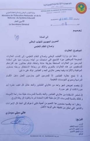 أصدرت وزارة التهذيب الوطني وإصلاح النظام التعليمي اليوم تعميما تتم بموجبه استفادة المعلمات من علاوة الطبشور، أثناء راحة الأمومة أو راحة المتوفى عنها زوجها.