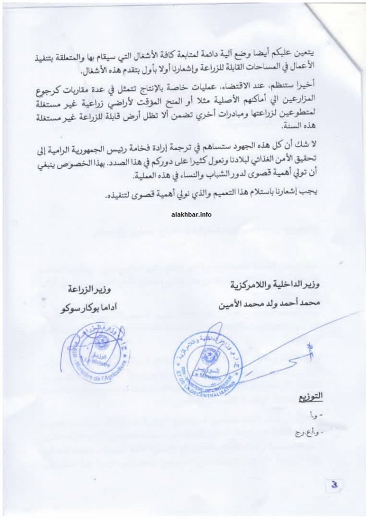 أصدر وزيرا الداخلية واللا مركزية محمد أحمد محمد الأمين، ووزير الزراعة آدم بوكار سوكو تعميما مشتركا ألزما بموجبه ولاة الولايات باتخاذ كافة الإجراءات الضرورية لاستغلال كل المساحات القابلة للزراعة بالمناطق المطرية والواحاتية على عموم التراب الوطني.